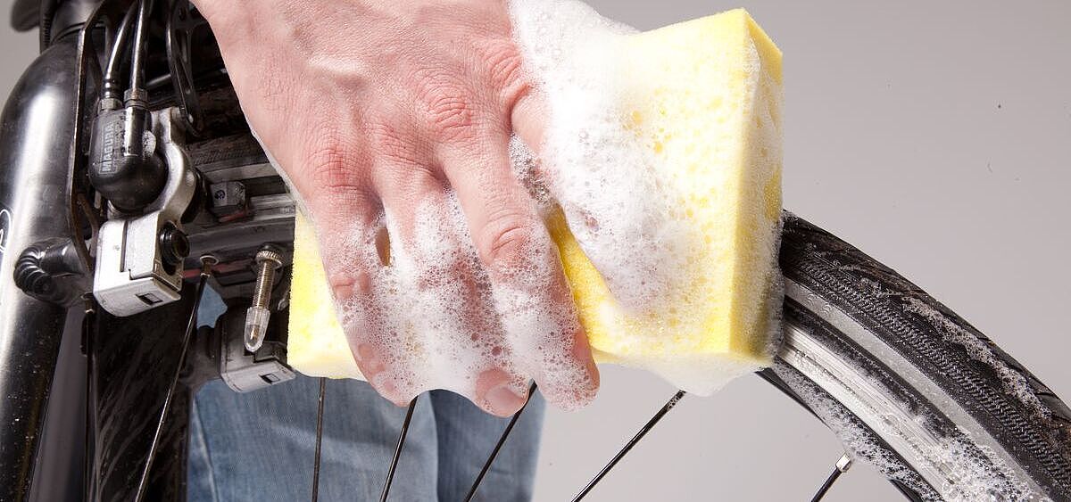Großaufnahme einer Hand mit Schwamm und Schaum, die ein Fahrrad-Vorderrad säubert.