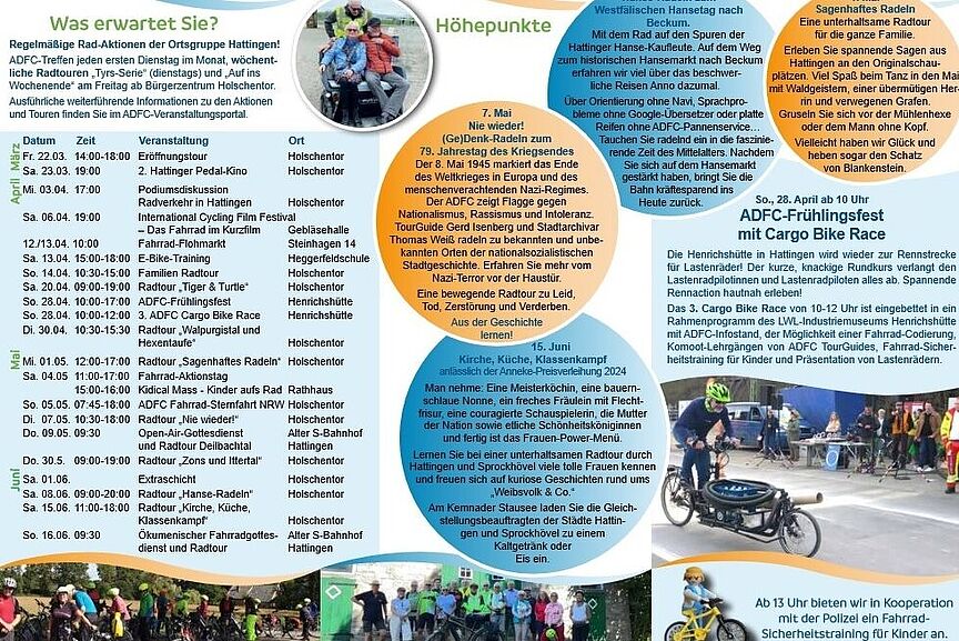 „Sagenhaftes Radeln“ rund um Hattingen, „Hanse-Radeln“ zum Hansetag nach Beckum und „Nie wieder!“ zum Kriegsende sind Radtouren des ADFC Hattingen in Kooperation mit dem Hattinger Stadtarchiv, „Kirche, Küche, Klassenkampf“, eine Radtour zu starken Frauen auch für schwache Männer, mit den Gleichstellungsbeauftragten sowie den Stadtarchiven Hattingen und Sprockhövel. In diesem Jahr feiert der Regionalverband Ruhr (RVR) den 25. Geburtstag der Route Industriekultur. Das LWL-Museum Henrichshütte gehört als Ziel- und Startort zweier Radtouren des RVR Fahrradsommers im Juni unter Leitung Hattinger ADFC Tourguides dazu: Hattinger Fahrradfrühling trifft RVR Fahrradsommer. Darüber hinaus lädt das Stadtradeln im Ennepe-Ruhr- Kreis vom 1. bis zum 21. Mai zum Rad-Kilometer-Sammeln ein.