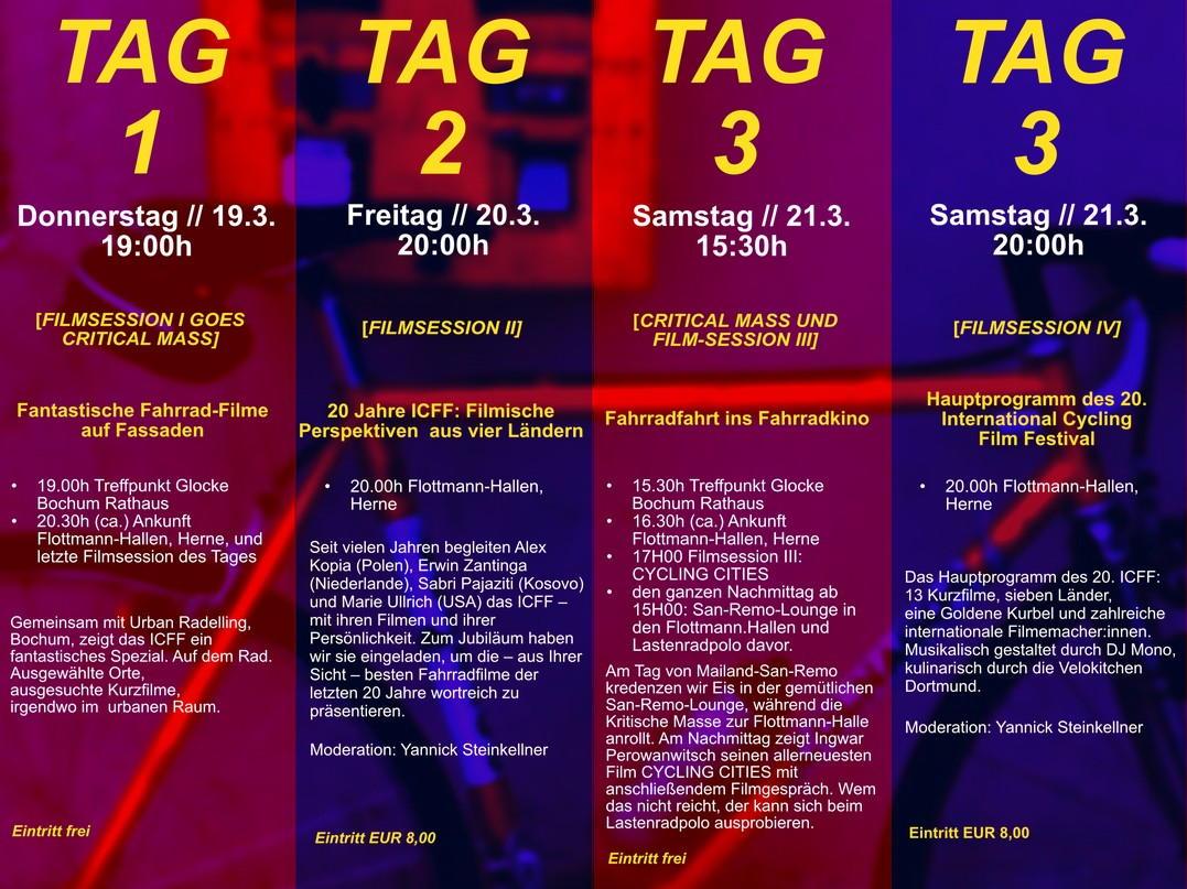 - Sa. 21. März 14:00 Uhr, International Cycling Film Festival, Holschentor, CM und Kino, Flottmann-Hallen