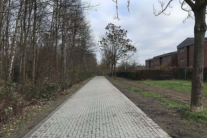 Dort hatten zum Beispiel Baumwurzeln die Asphaltdecke angehoben, so dass gefährliche Erhebungen entstanden waren. Auf der 200 Meter langen Strecke wurde die bisherige Asphaltdecke durch eine Pflasterfläche ersetzt.