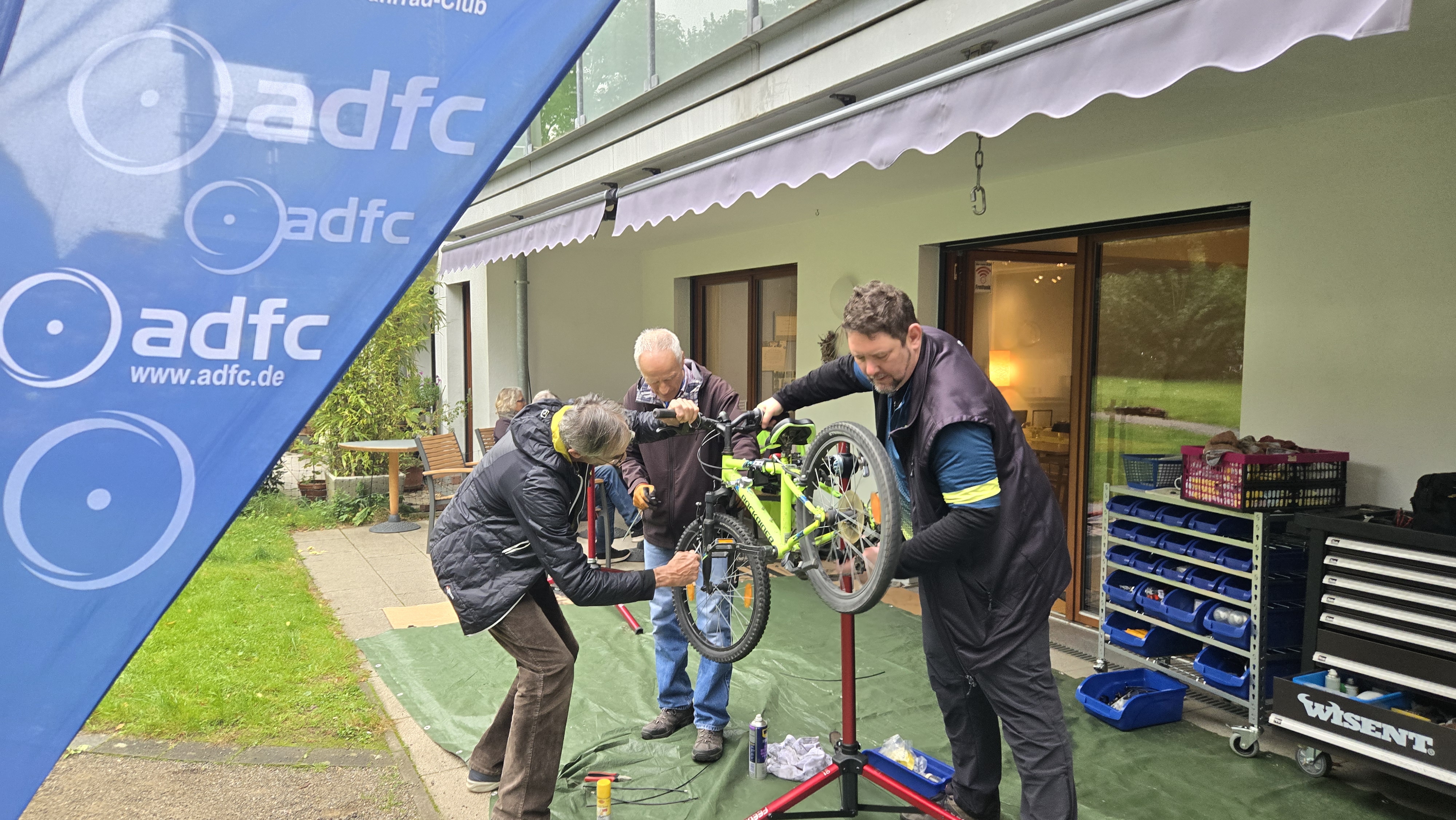 Auf dem Gelände des Wohnprojekts „Wir wohnen zusammen“ am Südring 23 nutzten zahlreiche Besucher die Gelegenheit zur „Hilfe zur Selbsthilfe“, um ihre Räder – vom Kinderrad bis zum Tourenrad – unter fachkundiger Anleitung der ehrenamtlichen ADFC-Mitstreiter wieder auf Vordermann zu bringen. Bremsen wurden eingestellt, Schaltungen justiert und verschlissene Züge ersetzt.