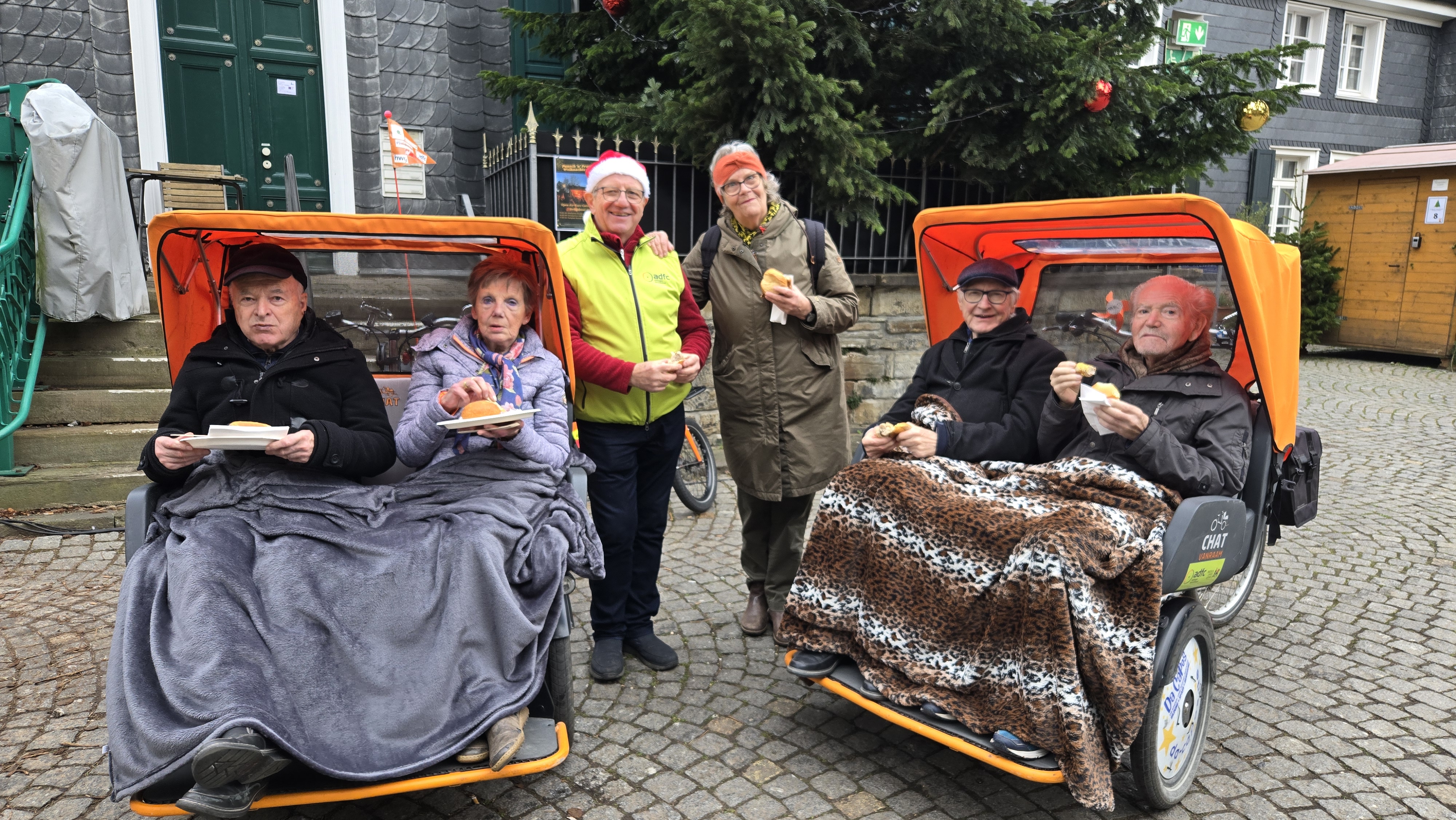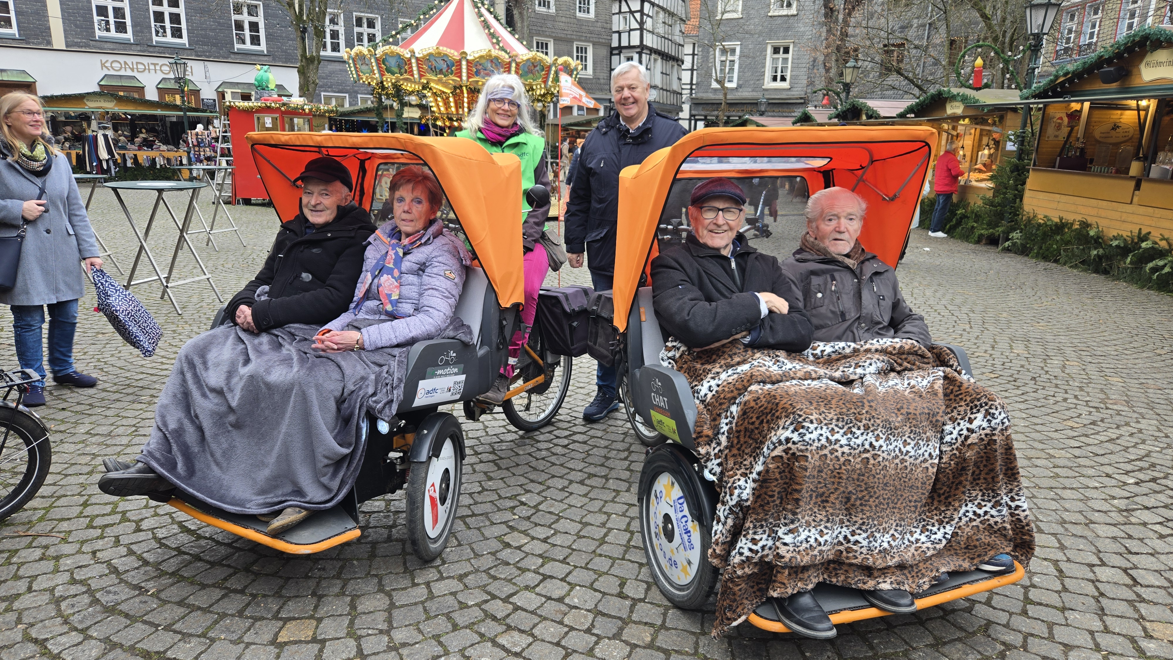 Die Rikscha-Projekt-Gruppe des ADFC Hattingen/Sprockhövel und der Katholischen Kirchengemeinde St. Peter und Paul zelebrierte auf den Weihnachtmärkten in Blankenstein und Hattingen weihnachtliche Rikscha-Höhepunkte zum Jahresende 2025.