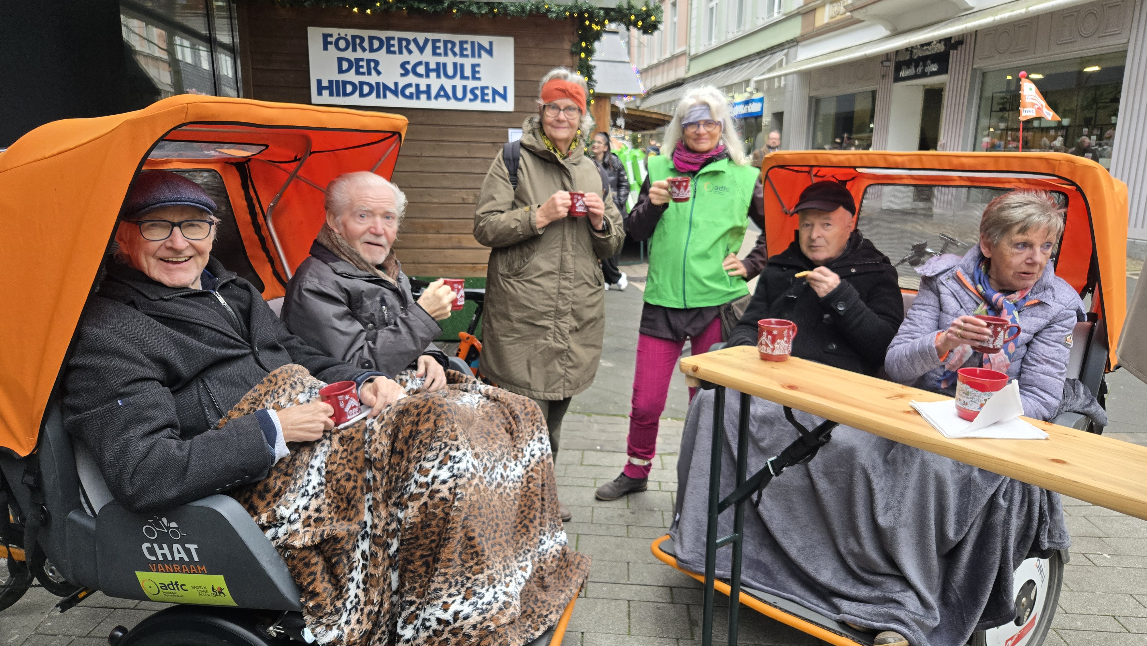Auf Initiative von Monika Pahl vom Wohnprojekt WirWohnenZusammen, die unter anderem Lieder-Nachmittage in der Demenz-WG Südring organisiert, kam noch ein Jahresabschluss der Rikscha-Saison zustande. Vier Seniorinnen und Senioren aus der Demenz-WG und der Maxi-Pflege wurde ein Hattinger Weihnachtsmarktbesuch mit der Rikscha geschenkt. Ein großes Hallo gab es auf dem Kirchplatz: Der Hausherr des Kirchplatz-Weihnachtsmarktes, Herr Schulte-Stade, empfing die Seniorinnen und Senioren sowie die Rikscha-Fahrerin Kristina Borgmeier und Fahrer Bernd Lauenroth, und lud sie zu Currywurst oder Bratwurst ein! Anschließend gab es noch einen Abstecher zum Waffelessen am Stand des Fördervereins der Schule Hiddinghausen. Zum Jahresabschluss wurden so noch einmal ordentlich Glücksmomente getankt.