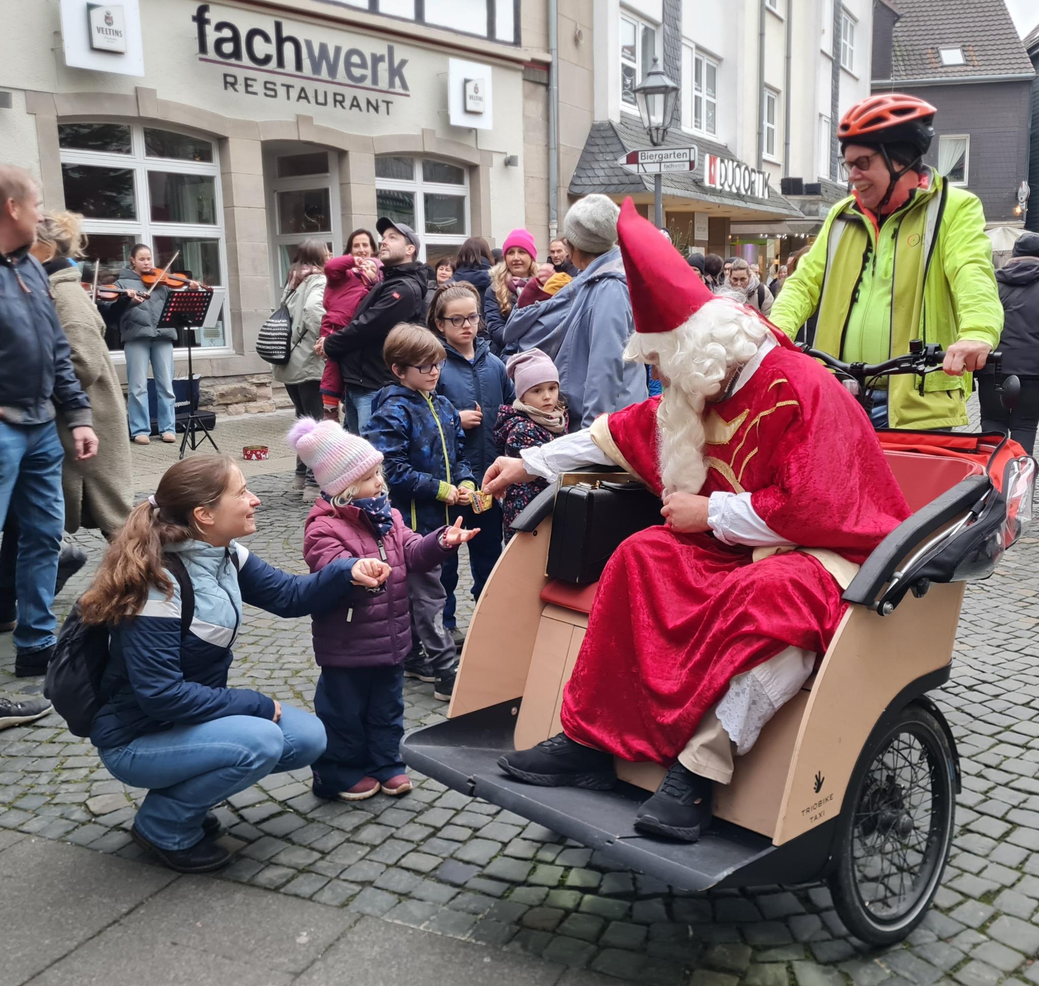 Bei der Jahresabschlussfeier des Nutzerrates des Bürgerzentrums Holschentor boten Gerd Isenberg unterstützt durch Claudia Koch Rikscha-Fahrten vom Bürgerzentrum zum Hattinger Weihnachtsmarkt an. Wie im Vorjahr war das Highlight die Fahrt mit dem Weihnachtsmann Hans Gerke, hauptberuflich Klarinettist der Hattinger Altstadtmusikanten, zum Untermarkt und zum Kirchplatz.